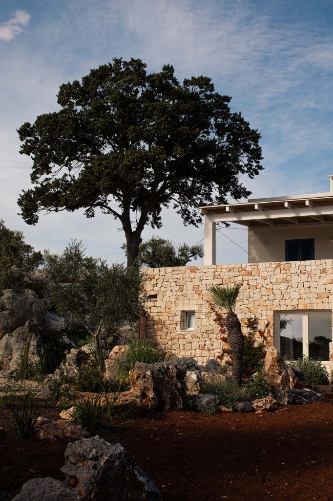 Candida e armoniosa, Casa Regina vive in perfetto equilibrio con la roccia antica, gli ulivi e la macchia mediterranea.