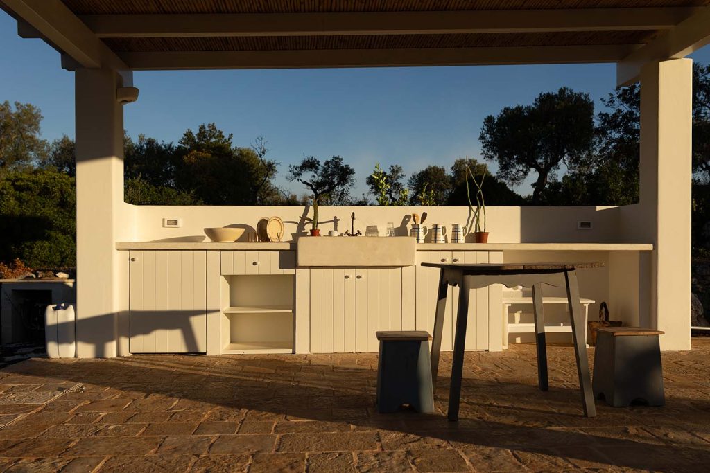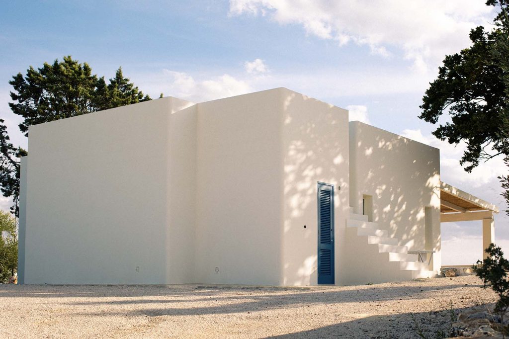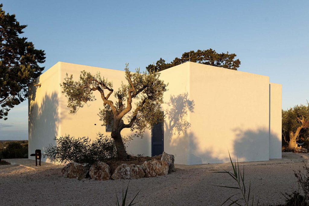 Tra gli ulivi e la pietra viva, una villa bianca respira luce e silenzio.