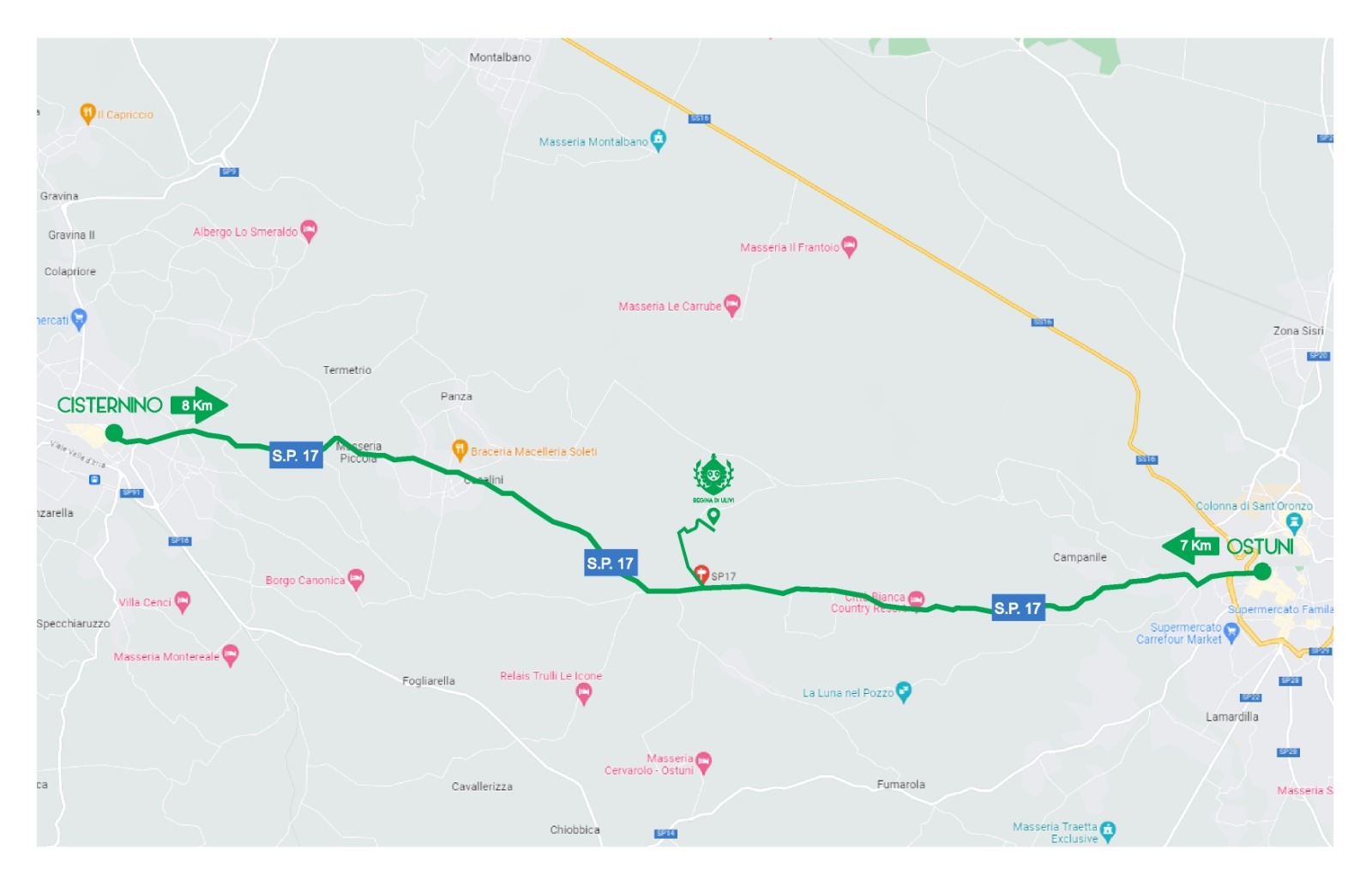 Per arrivare a Regina bisogna prendere la Sp17 da Cisternino o da Ostuni, noi siamo nel mezzo, si arriva girando in Contrada La Chiusa e seguendo la stradina per circa 1km, troverete poi il cartello per arrivare a Regina di Ulivi