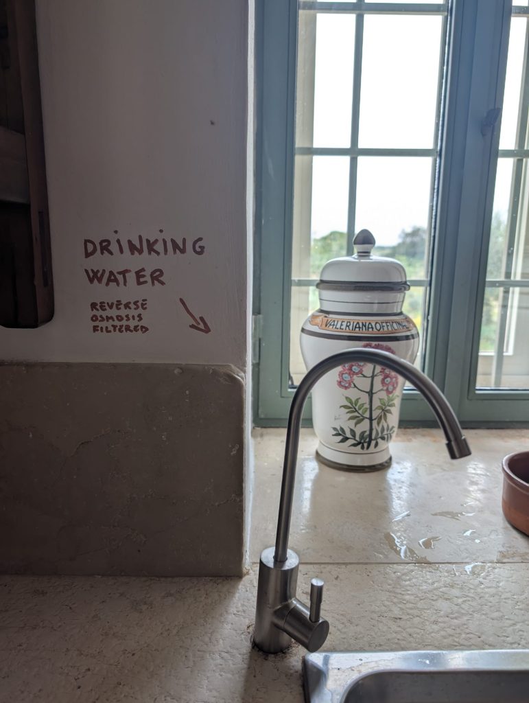 In cucina c’è un frigo bar qualora vogliate acquistare bevande fresche, sul bancone troverete un foglio dove segnare ciò che si prende. E anche un rubinetto di acqua osmotizzata dove poter riempire la bottiglia che troverete già piena in camera quando ne avrete bisogno.