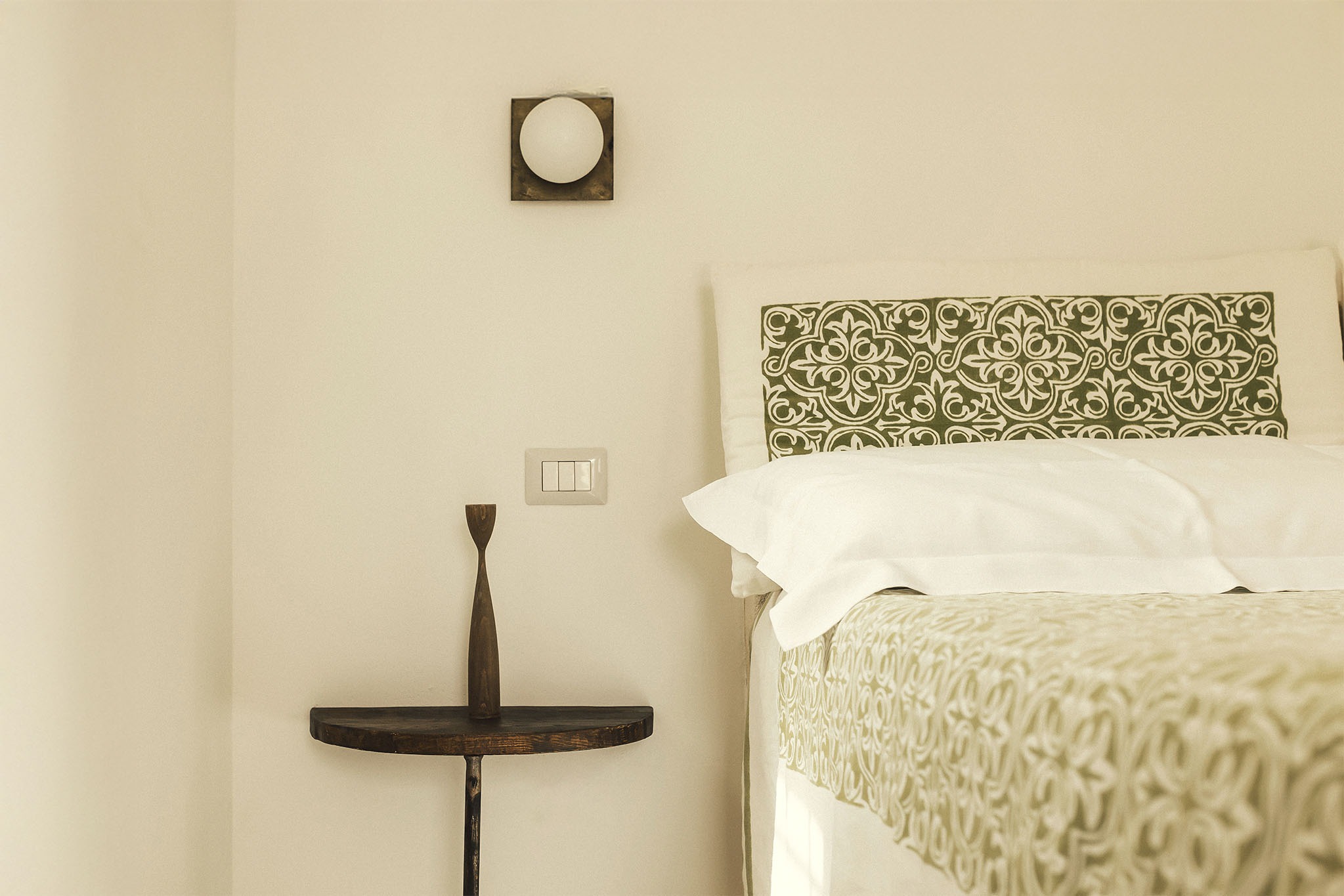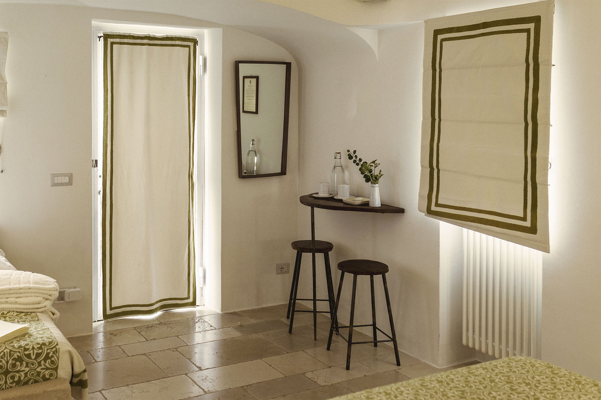 Decorato con motivi color “verde acido” che – abbinati al “talco” dei muri e alla pietra dei pavimenti – crea al suo interno un’atmosfera gioiosa e raffinata.